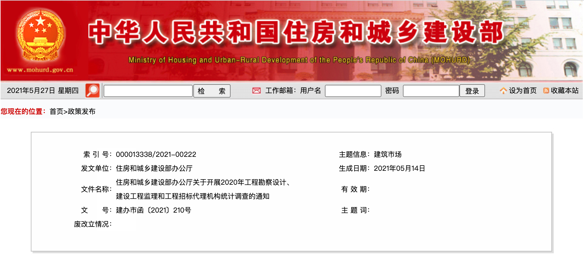 住建部:开展2020年工程勘察设计、建设工程监理和工程 招标代理机构统计调查的通知