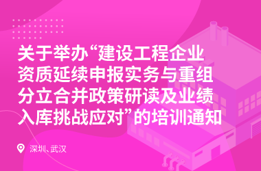自2023年9月起,住房和城乡建设部对企业资质管理提出了全新的要求,旨在进一步强化行业规范与提升服务质量。为积极响应国家“证照分离”改革的深化实施,并依据2023年12月28日发布的《住房城乡建设部办公厅关于做好有关建设工程企业资质证书换领和延续工作的通知》,我们特此举办“建设工程企业资质延续申报实务与重组分立合并政策研读及业绩入库挑战应对”专题培训班。本培训班旨在帮助各相关企业深入理解最新政策,熟练掌握资质管理的各项实务操作。现将有关事项通知如下: