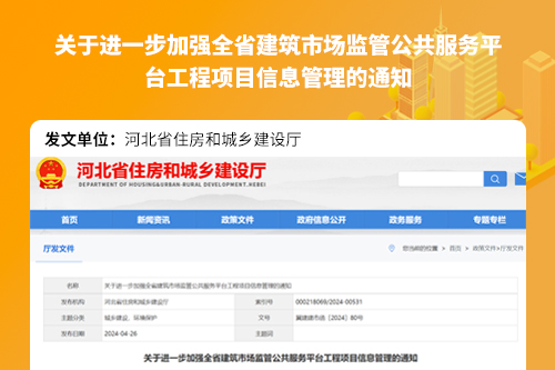 2024-04-30 13:54:50为进一步规范工程项目管理,提升信息质量和共享服务能力,按照住房城乡建设部《关于进一步加强全国建筑市场监管公共服务平台项目信息管理的通知》《关于进一步加强建设工程企业资质审批管理工作的通知》精神,我厅已完成对“河北省建筑市场监管公共服务平台”(以下简称“省平台”)的改造升级,现就做好工程项目信息归集和补录工作有关事宜通知如下
