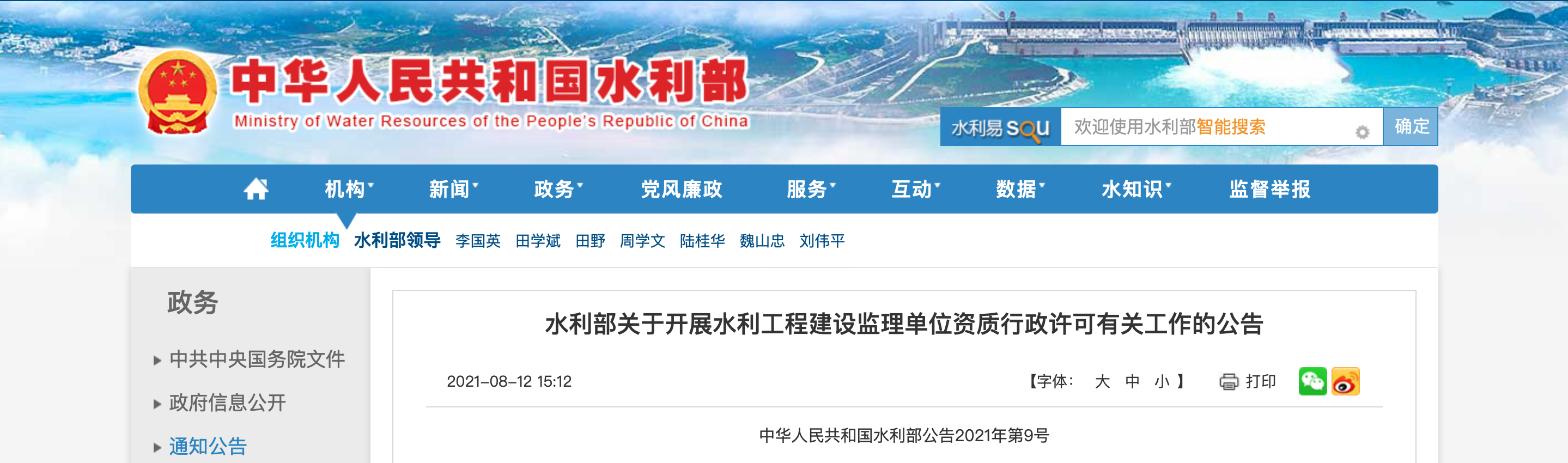 水利部:关于开展水利工程建设监理单位资质行政许可有关工作的公告