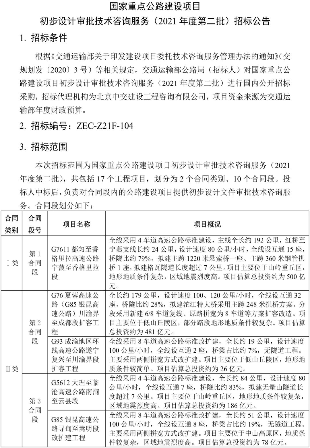 国家重点公路建设项目初步设计审批技术咨询服务(2021年度第二批)招标公告