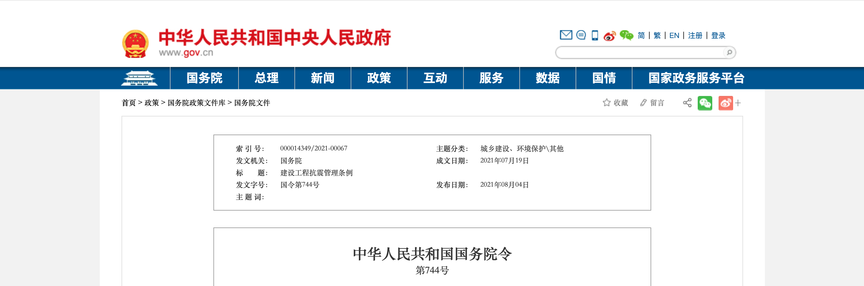 《建设工程抗震管理条例》已经2021年5月12日国务院第135次常务会议通过,现予公布,自2021年9月1日起施行。