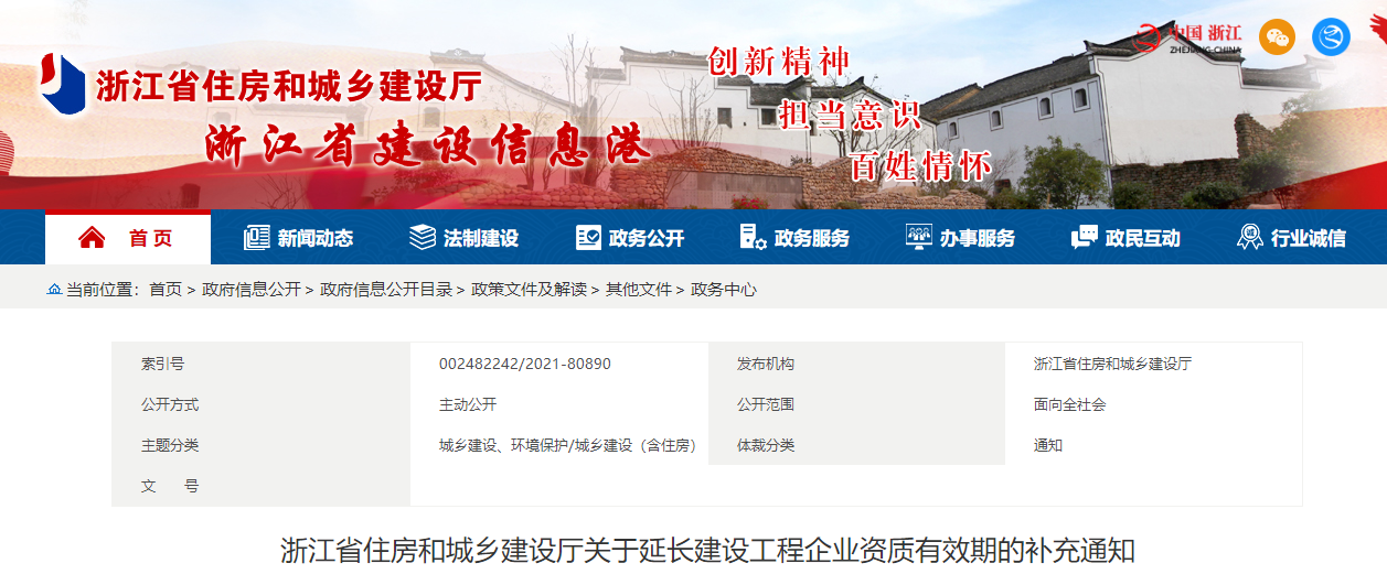 根据《住房和城乡建设部办公厅关于建设工程企业资质统一延续有关事项的通知》(建办市函〔2021〕510号)精神,经研究,决定调整《浙江省住房和城乡建设厅关于延长建设工程企业资质有效期的通知》(浙建政服发〔2021〕62号,以下简称“原通知”)有关内容。现将有关事项通知如下: